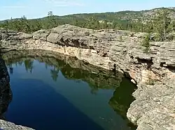 Lake Shaitankol is one popular areas in the park. The lake got its name, which translates to "Devil's Lake", allegedly due to a high number of hunters getting lost in the area, sparking rumors that the devil was at work.[2] The lake is located at 1200m above sea level and is 5 km (3.1 mi) west of the city Karkaraly. You reach the lake on the eco-trail “The Legend of Lake Shaitankok.” The lake is accessible by foot and generally takes 5 hours round-trip. The lake is oval in shape and surrounded by rock cliffs up to 10m high. The depth of the lake is unknown. The water level does not decrease throughout the year because it is fed underground water and precipitation.