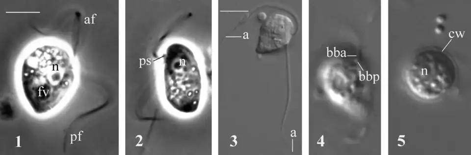 | Light contrast microphotograph of K. gromovi showing anterior (af) and posterior (pf) flagella, a nucleus (n) and a vacuole (fv) | |