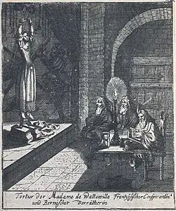 In December 1689, her messenger was intercepted and captured.[2] Von Wattenwyl was then arrested in the middle of the night and imprisoned at Käfigturm, where she was severely tortured for weeks.[3][2]