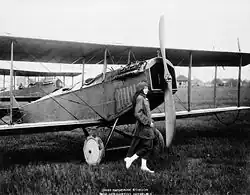 Stinson learned to drive the family flivver at the age of 14. In 1911, she took her first flight aloft in a hot-air balloon in Kansas City.[7] Smitten by the flying bug, Stinson sold her piano to help pay for flying lessons. Stinson went to St. Louis to take flight lessons from Tony Jannus, who allowed her to fly only as a passenger.[8] She then took flying lessons from the well-known aviator Max Lillie, a pilot for the Wright Brothers, who initially refused to teach her because she was female. However, Stinson was able to solo the Wright Model B, after only four hours of instruction,[9] on July 13, 1912, at Cicero Field.[10]