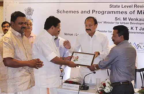 A significant achievement for Kattappana in sanitation was attaining the distinction of an Open Defecation Free Municipality in Kerala. Kattappana was first civic body in the State of Kerala to achieve this status.[6] This recognition was conferred upon the then chairman, Shri Johny Kulampallil, by the Union Minister for Urban Development, Housing & Urban Poverty Alleviation and Information & Broadcasting, Shri M. Venkaiah Naidu, during a ceremony held in Kochi on 18 October 2016.