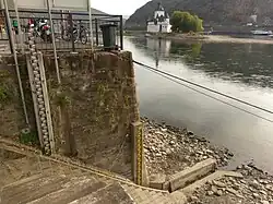 The Kaub gauging station (German: Pegel Kaub, Kauber Pegel) is a stream gauge located on the Rhine river in the German city of Kaub. It is a "decisive" water level measurement site for the Rhine, as Kaub is located at the shallowest part of the Middle Rhine and ships with freight from North Sea ports have to pass Kaub on their way to the industrial southwest of Germany.[1] The gauge level does not directly correspond to the actual depth of the river (zero level is not at the riverbed); instead, as is the case with most Rhine gauges, the actual depth of the navigation channel is defined as:[2]