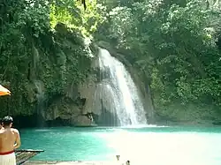 The Kawasan Falls is a three-stage cascade of clear turquoise water from mountain springs located in the jungles of the Cebu island. The falls are part of the Kawasan River in Badian, Cebu, in the Philippines.[2] The water from the falls originates from the Kabukalan Spring and passes through the Kawasan gorge en route to the Matutinao River and the Tanon Strait.[3] The largest waterfall is about 40 meters high, followed by smaller cascades and turquoise water pools that invite swimming.[4] It is a popular tourist destination and is known for its tranquil and relaxing environment, and the adventurous can even enjoy a raft ride or a dive off cliffs.[5]