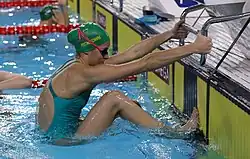 On day two, McKeown won the gold medal in the 100 metre backstroke with a personal best time of 55.49 seconds.[25][26] The morning of day three, she ranked tenth in the preliminaries of the 50 metre backstroke with a time of 26.24 seconds and advanced to the semifinals.[27] In the evening semifinals, she placed ninth with a time of 26.09 seconds.[28] Two days later, she swam the backstroke portion of the 4×50 metre medley relay in the preliminaries in a time of 26.42 seconds, helping qualify the relay to the final ranking first in an Oceanian and Australian record time of 1:44.78.[29] When the finals relay placed first in a time of 1:42.35, she won a gold medal for her efforts in the preliminaries.[30]