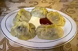 The introduction of flour to Kazakh cuisine brought about dishes such as bawyrsaq (бауырсақ), shelpek (шелпек), mänti (мәнті), and nan (нан). Bawyrsaq is made by frying dough balls, and shelpek is a flat cake made in a similar fashion.[7] Mänti, a very popular Kazakh dish, is a spiced mixture of ground lamb (or beef) spiced with black pepper, enclosed in a dough wrapper. Mänti are cooked in a multi-level steamer and served topped with butter, sour cream, or onion sauce. Nan is a type of traditional bread made in the tandyr oven, popular in cities along the Silk Road. Quymaq (құймақ), qattama (қаттама), and oyma (ойма) are flat puff cakes fried in oil, then covered in cream. Another sweet is shek-shek (шек-шек).