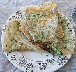 Kelane[1] or Kelaneh (Kurdish: کەلانە, romanized: Kelane), also known as Kalana by some, is known primarily for being a type of bread or pastry,[1] but the term encompasses a full meal that is particular to the Avroman region of Kurdistan. In spring, the bread is filled with wheat flour and a kind of honeysuckle called ivy, while in other seasons onions are the filling.[2][3][4] Traditionally this flatbread is filled with scallion (or chives or wild garlic) and made them a smaller size to fit in a frying pan on a home stove compared to the convex metal griddle over an open fire (saj).[5]