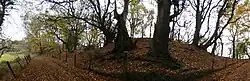 There are three associated scheduled sites containing underground structures, rare examples of Auxiliary Unit constructions built in World War II to defend against Nazi invasion: an operational base (location: 51.6211, −2.8971, 35 metres diameter) and ammunition store (location: 51.6214, −2.8967, 20 metres diameter) – both in the woods on the northeast side of Pen-toppen-ash – and a 'special duties section' (location: 51.6186, −2.9018, 20 metres square) on the very northwest edge of Pen-toppen-ash.[18]