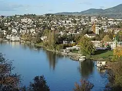 Kempraten-Lenggis was a village of the former independent municipality of Jona that in 2006 merged with Rapperswil to the town of Rapperswil-Jona. It is located on the right-hand (northeastern) shore of Lake Zurich (German: Zürichsee) northerly of Rapperswil on the so-called Kempratnerbucht, literally "Bay of Kempraten". This natural indentation on the eastern lake shore extends between Feldbach, Hombrechtikon, and Rapperswil on a length of about 3 kilometres (2 mi). Due to its location, the area was already inhabited in pre-Roman times and once was used as a natural harbor. To the east, Kempraten is bordered by the bay respectively the Lindenhof hill in Rapperswil. These area of the village is called Kempraten.