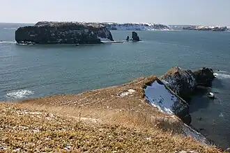 Kenbokki Island (嶮暮帰島, Kenbokki-tō) is an uninhabited island in Hamanaka, Hokkaidō, Japan. The island, with a 4.5-kilometer coastline, forms part of Akkeshi Prefectural Natural Park.[2] The name is derived from the Ainu kene-pok or "beneath the alder" (Alnus japonica).[3] During studies in 1999, four species of mammal (long-clawed shrew, grey-sided vole, harbour seal, and visiting sika deer) and forty-one species of birds were recorded on the island; there were no amphibians or reptiles.[4] Of the birds, Leach's storm petrel (some twenty thousand pairs), Japanese cormorant, Japanese snipe, slaty-backed gull, and common reed bunting were identified as breeding on Kenbokki.[4] Flora include Gentiana triflora var. japonica (エゾリンドウ), Hemerocallis esculenta, and lily-of-the-valley.[5] Masanori Hata founded Mutsugorō Animal Kingdom (ムツゴロウ動物王国) after his stay on the island.[2]