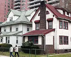 Throughout much of the 20th century, Kensington was seldom distinguished as a distinct neighborhood, with many residents and demographers identifying the area as the western section of Flatbush.[10][11][12][13] The descriptor West Flatbush was also used by various religious & civic organizations and urban planners in the first half of the 20th century before largely falling into disuse after 1954.[14][15][16] While the Kensington moniker continued to be employed by branches of certain governmental institutions (including the Post Office Department and the Brooklyn Public Library), it was also used by demographers to differentiate the largely working class, ethnically heterogeneous[17] tracts west of Ocean Parkway from the historically affluent, Old Stock and Jewish American-dominated tracts east of Coney Island Avenue.[18] A 1945 fifteen-year retrospective study of Brooklyn Protestantism by the Committee for Cooperative Field Research included the Kensington tracts between the historical villages of Windsor Terrace and Parkville (alternatively characterized as the "Ocean Parkway corridor") within the boundaries of Flatbush, also noting that a contemporaneous survey of 3,072 families indicated that 41% of residents identified as Roman Catholic (exemplified by a recent influx of second and third-generation Italian Americans from South Brooklyn and other northern neighborhoods), 33% as Jewish (primarily concentrated in apartment houses on "main traffic ways") and 26% as Protestant, with the latter population remaining concentrated in "private dwellings on the side streets" amid an ongoing decline.[19] In his 2015 memoir, musician Marky Ramone (who resided at 640 Ditmas Avenue throughout much of his childhood in the 1960s) noted the area's distance from major thoroughfares in eastern Flatbush, necessitating a two-fare public transit zone via bus to Erasmus Hall High School.[20]