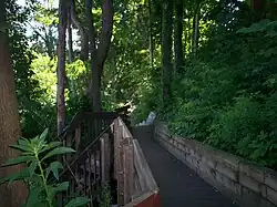 Boardwalk in Franklin Mills Riveredge Park connecting the dam to Tannery Park. The boardwalk closely follows the path of the old mill race.