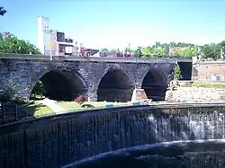 The 1836 dam with the 1877 Main Street Bridge behind. Heritage Park, dedicated in 2005, is located between the dam and bridge. Water is artificially pumped over the dam.