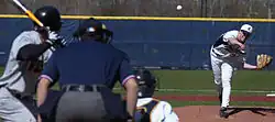 The team was established in 1914 at the new Kent State Normal School, which was established in 1910 and had its first classes in 1912 at temporary locations. The new campus opened in May 1913. The team is the second intercollegiate athletic team at Kent State, formed just after the men's basketball team, which was established in late 1913. H.E. Nickerson served as manager and William Brown was captain of that first team in 1914. No records of any games are available, though a photo of that team, labeled as the "Ex Temporé Base Ball Team", exists from that season.[2] The following year, the "Normal Nine", coached by school custodian Alexander Whyte, played their first recorded intercollegiate games, opening the season with a 7–6 win over Baldwin Wallace College in Kent. The team finished 1–3 that season and games were held on an informal field in front of the campus, which is now largely occupied by Rockwell Hall.[3][4] Alf Lovall coached the team to a 1–2 record in 1916 and Paul Chandler led the team to a 3–0 record in 1922. The records for the 1917–21 and 1923–25 seasons are incomplete, though it was during the 1923 season that the various Kent State Normal College teams began being referred to as the Silver Foxes. The team also began play at Rockwell Field around 1920, their home field through the 1941 season.[5]