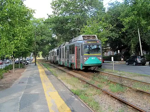 Track work in 2018–19, which included replacement of platform edges at several stops, triggered requirements for accessibility modifications at those stops.[2] Design work for Kent Street and seven other C Branch stations was 15% complete by December 2022.[3] Plans shown in February 2024 called for Kent Street station to be closed, as it is just 830 feet (250 m) from both St. Paul Street and Hawes Street stations.[4] In May 2024, the Federal Transit Administration awarded the MBTA $67 million for the platform projects.[5] As of June 2024, construction of the C Branch platform project is expected to be complete in fall 2026.[6]