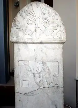 The Kerameikos steles are a collection of sculptures used as grave-markers (steles, sing. stele) in the Kerameikos necropolis of Attica. Kerameikos is located outside the Themistoclean Wall's Dipylon Gate. Stelai come in various shapes/designs and depict images varying from pottery to narrative scenes. They were often marble or limestone, and were carved or sculpted to depict the person being memorialized sometimes with relatives or slaves. Reliefs decorating the graves were meant to show the dead in their best light, using imagery to recognize their bravery in battle, or pathos, or wealth. These monuments marked the graves of Athenian men, fallen warriors, as well as non-citizens.[1] Women were also included in Kerameikos but typically it was the wealthiest or prominent women who were given stele.[2] In many vase paintings of grave scenes wreaths are seen resting at the base of stele. This was likely a popular way to adorn the graves of loved ones.