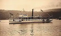 Keuka Lake has a long history of waterborne transport. Early in the 19th century, George McClure of Bath launched a sailboat, the schooner Sally, on Keuka Lake, then called Crooked Lake, which transported wheat and other goods between Hammondsport, located on the southern tip of Keuka Lake, and Penn Yan, located at the northern tip. Before long steamboats made the scene and were transporting grain and other produce, grown in the lake area, across the lake to Hammondsport, where it was transported by wagons to other points.[14] By 1835 there were several steamboats running on the lake, which typically made runs between Hammondsport and Penn Yan. The first steamboat built was called the Keuka Maid, a sidewheeler of 85 feet in length, with a steam engine that was fueled by wood.[15][12] The vessel remained in service until it grounded in mud and was subsequently dismantled in 1848. The second steamboat to appear was the Steuben, a side-wheeler, built in 1845, whose captain was John Gregg. In 1864 it caught fire while docked at Penn Yan.[16] In 1847, Lemuel Hastings was the first to ship a large quantity of grapes and jelly via the canal to New York City.[17] Following was the steamer the George R. Youngs, was launched in 1864. This vessel was 130 feet in length with an elaborate dining room. The vessel was rechristened the Steuben and remained in service until in 1879. Captain Allen Wood Keuka, introduced the Keuka, a screw steamer, to the lake in 1867. Shortly thereafter the Yates, a 115-foot sidewheeler, operated on the lake from 1872 to 1883, until she caught fire from the furnace and her boiler, which became typical of many steamboats on the lake. In 1878, a new sidewheeler, the Lulu, made her maiden voyage down the 21 miles of lake. [16][12]