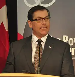 Kevin A. Sorenson PC (born November 3, 1958) is a Canadian politician who represented the riding of Battle River-Crowfoot (known as Crowfoot from 2000 to 2015) in the House of Commons of Canada from 2000 to 2019, first as a member of the Canadian Alliance (2000–2003) and then as a member of the Conservative Party of Canada. He served as Minister of State for Finance under Prime Minister Stephen Harper from July 15, 2013 until the end of the Harper Government on November 4, 2015.[1] He also served as the Opposition critic to the Solicitor General, the associate critic for Public Safety and Emergency Preparedness, and the deputy critic for Justice.