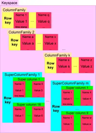 2. ^ "Overview: Terminology/Abbreviations: Keyspace". Cassandra Wiki. Archived from the original on 2013-07-23. Retrieved 2011-03-31. [A Keyspace] Contains multiple Column Families.