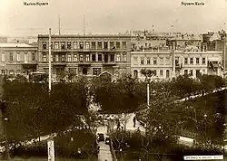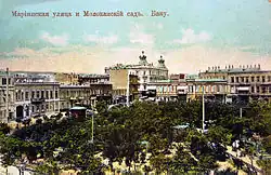 In the second half of the 19th century, when the oil and related industries began to develop intensively, the residential areas already accounted for a significant percentage of the citywide development in the northeastern part of the Icheri Sheher fortress (the historical district of Baku). In the 1860s, the Molokan settlement arose in the suburb sphere of influence and served as a farmers' market (Russian: rinok). In connection with the development of the central quarters, the Molokan Slobodka with its courtyards and stables was demolished to the ground, and the Molokans were relocated to a completely new area of Zavokzalye, where a new Molokan carriage settlement was created.[2] On the site of the settlement, the Mariinsky Square was laid out.[3] The square was created in the early 1870s in the immediate vicinity of the rich residential areas.[1] The square was located in one of the central districts of the city – Primorsky. The parks surrounding neighborhoods gave it a reserved character.
