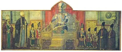 A mural in the Nizamiyeh mansion.the Naser Aldin Shah Qajar as Shah and Mirza Aqa Khan Nuri is seen as the Prime Minister.