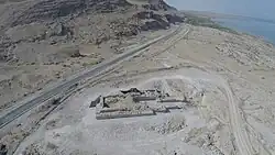 Khirbet Mazin (Metzad Kidron) consists of the ruins of a fortress and anchorage.[1] The fortress was enlarged and a dry dock was added during the Hasmonean times as part of their policy to rule the Dead Sea shores. Bronze coins and scraps from a shipwreck were founds outside of the anchorage.[1]