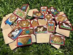 There are four copies of each rank except for the Dragon, Rooster, Dog and Pig which only have two. Less common sets may forgo the Khas and Norov ranks in exchange for having every remaining rank with four tiles. Older sets may have more ranks taken from the Ashtamangala such as the endless knot, pair of fish, and conch. Numbers 6 to 17 are the signs of the Chinese Zodiac; Tuvans play the game with domino tiles instead.[4] The earliest versions of both types of sets lacked the Ashtamangala tiles.