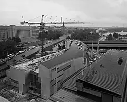 An architectural design competition to design a building for the contemporary arts museum was held in 1992. The competition was open to architects from the Nordic and Baltic countries, in addition to which four architects or studios from elsewhere were invited to participate, though they were obliged to submit their proposals anonymously: Steven Holl from the US, Alvaro Siza from Portugal, Coop Himmelb(l)au from Austria, and Kazuo Shinohara from Japan.[1] The competition results were announced in 1993, and the winning proposal, titled Chiasma by Steven Holl, was selected from the 516 submitted entries. The design of the building, Finnish-ized as "Kiasma", underwent slight modification during the design process, but nevertheless was regarded as controversial; for instance its close proximity to the equestrian statue of Finnish President Carl Gustaf Emil Mannerheim.[2] Construction work began in 1996, and the museum opened in May 1998.[3]