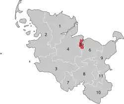 Kiel is located in central Schleswig-Holstein. As of the 2021 federal election, it comprises the entirety of the urban district of Kiel, as well as the municipalities of Altenholz and Kronshagen from the Rendsburg-Eckernförde district.[1]