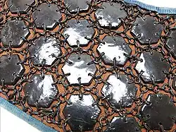 Kikkō refers to the shell of the tortoise or turtle which is formed from small hexagon plates.[2] Individual kikko armour plates were attached to armour by sewing the kikko to a cloth lining through holes drilled in the center or edges of the kikko. Kikko could be sewn between two layers of cloth and hidden from sight. The kikko could be attached to each other by links of chainmail holes drilled in the edges of the kikko. Kikko armor was made for every class of samurai or soldier, high or low.