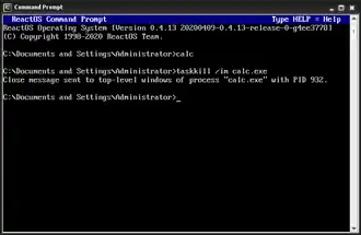 taskkill command on ReactOSThe ReactOS implementation is based on the Windows variant. It was developed by Andrew Riedi, Andrew Nguyen, and He Yang. It is licensed under the LGPLv2.1 or later.[8]