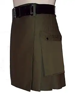 Starting in the late 1990s, contemporary kilts (also known as modern kilts, fashion kilts, and, especially in the United States, utility kilts) have appeared in the clothing marketplace in Scotland,[41] the US, and Canada in a range of fabrics, including leather, denim, corduroy, and cotton.[42] They may be designed for formal or casual dress, for use in sports or outdoor recreation, or as white or blue collar workwear. Some are closely modelled on traditional Scottish kilts, but others are similar only in being knee-length skirt-like garments for men. They may have box pleats, symmetrical knife pleats and be fastened by snaps, studs or velcro instead of buckles. Many are designed to be worn without a sporran, and may have pockets or tool belts attached.