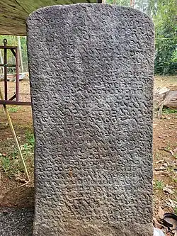 The old Malayalam record, in Vattezhuthu (script) with necessary Grantha characters, reveals the ancient name of the Kinalur village as "Kunavaynallur".[1] It seems that Kunavaynallur was named after Thirukkunavay Shrine, a lost Jain temple near Kodungallur.[3] The inscription is engraved on both sides of a single granite slab (it was discovered from the Puvembayi Shiva Temple compound in Kinalur).[1][2] The estampage of the record can be found in Government Epigraphist's Office, Mysore.[1]