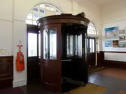 It had wide entrance doors: three doors with moulded panels, patent floor springs and brass fingerplates, and swing windows in the top panels. The windows were glazed with 0.25 inches (0.64 cm) British polished plate glass. The window over the doorway had a heron and border painted on cathedral glass.[30] The lobby had moulded corner posts and panelling, and a moulded cornice. Beyond the lobby was a central hall 38 feet (12 m) by 31 feet (9.4 m) by 16 feet (4.9 m) high, with a dado of tinted, glazed bricks. The hall ceiling had a ventilated roof lantern which doubled as the base of the bandstand above. There was 1 inch (2.5 cm) tongue and groove wood flooring laid on 4.5 inches (11 cm) by 3 inches (7.6 cm) joists, and a brown glazed brick skirting, a dado and salmon–coloured walls. Today as in 1904 the ceiling appears panelled, being broken up by girders supporting the roof, and supported by "ornamental iron columns with moulded bases and capitals;" the form of the ceiling lantern remains, but is unventilated. The walls still have the original pilasters with capitals to match the central columns. In 1904 the hall had a 3 feet (0.91 m) high platform stage with moulded panels and corners. Above that was a Victoria stone memorial tablet saying: "This pavilion was presented to the town of Herne Bay by Thomas Dence Esq., 1903. Architect F.W.J. Palmer C.E., surveyor to the Council. Builder A.S. Ingleton, Herne Bay".[12]