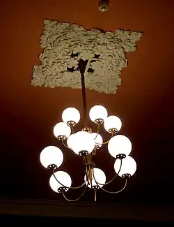 At a size of 136 feet (41 m) long, 60 feet (18 m) wide and 20 feet (6.1 m) high, the Hall provided space for seating 1,500.[6] In 1913 the ceiling was plastered with a cornice and a "deep frieze of a delicate tint, and a picture moulding" around three sides of the Hall; this has now been replaced.[2] The four main reinforced concrete roof beams create five ceiling bays, and in each bay are three plaster centrepieces representing vines and grapes. These are ventilator-covers. The middle one of each three originally carried copper bronze electroliers with chains and Holophane reflectors.[2] (Today, more numerous and bigger lights are fixed there.) The walls were originally largely of glass and painted in eau de nil or pale green, with a darker shade on the dado.[2][3] The special dance floor was rock maple over concrete, and the acoustics were said to be "perfect".[2][3] There was a further tiered seating area on the roof for 1,100 deckchairs facing the cast iron bandstand and linking the roof with the Downs.[3][6] The roof was "illuminated by five electric light standards, and the columns, the upper ornamental part of the bandstand, and the ribs of the bandstand roof [were] picked out with fairylights."[2] The box office in the vestibule was "artistically designed . . . of brick faced with plaster in the Georgian style."[2] The marble plaque on its front was carved by Emil Fuchs who had designed the King Edward VII Coronation Medal.[35] The old tongue-and-groove wood flooring of the vestibule was now replaced with terrazzo paving, with the town crest decorating the area in front of the kiosk (today this is covered over, or possibly removed). Over the Hall's exit doors (now removed) and over the kiosk were bullseye glass circles.[2][3]