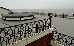 Through a door at the south-west corner of the main hall (now the vestibule) there was a York stone staircase to the roof and road, with 13 inches (33 cm) deep by 6 inches (15 cm) high by 4 feet (1.2 m) wide treads and a wrought iron handrail. The terraced roof, which as of 2013 still exists, was intended for promenade concerts with an audience of 700. It runs over to cover the verandah supported by iron columns and ornamental ironwork supplied by MacFarlane & Co of Glasgow in 1904 and still visible today. The bandstand (demolished 1969) had a "roof supported by slender iron pillars and fenced with elaborately designed ironwork." At the east and west of the building there were Victoria stone drinking fountains (the eastern one was still visible as of 2011). The walls, wood and ironwork were painted with Velure.[12][31]