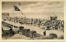 In 1913 the Pavilion was developed as a memorial to the late King Edward VII. The architect was again the council surveyor F.W.J. Palmer who presented his plans in April 1911. The council applied to the Local Government Board (LGB) for a loan,[33] and the work cost £6,000: £5,000 for the excavation and construction; £1,000 for furnishings. £5,956 was received from the LGB in August 1912.[2] The builders were Hardy & Co. of Woking whose tender of £5,578 on 16 September 1912 was accepted for the erection work, and one of the contractors was electricity company Hunt & Sons of Charles Street, Herne Bay, who ran a cable underground from their works, beneath Canterbury Road and through the cliff.[2][6] The entertainers Rouse, Way & Wilson made an advance investment of £700 in the theatre, the profits to be shared by the council. The excavation commenced in October 1912, and "many thousands of yards of London Clay" were removed to extend the building into the cliff.[2] The 1904 building was incorporated and extended as a theatre, concert hall and dance hall below the Downs on East Cliff, and the existing small auditorium became the vestibule for the new hall. The 1913 Hall was designed to accommodate 1,500, with 1,100 in the open-air theatre on the roof.[2] The high price for this build partly reflects the large excavation into the cliff for the Hall, and the early use of ferro-concrete, with steel bars made by the Spiral Bond Bar Company, who had patented the process that they used in the same year.[6][34] The building was specially designed not to interfere with the view from houses on Beacon Hill to the south; nevertheless a 60 feet (18 m) flagstaff was erected between the Hall and the Beacon Hill estate.[2]