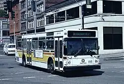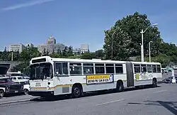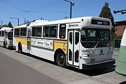 Upon taking over transit operations on January 1, 1973, Metro used buses acquired from predecessor agencies Seattle Transit System and the Metropolitan Transit Corporation, still painted in their original colors.[4] Metro acquired the 91-bus fleet of the Metropolitan Transit Company in December 1972 at a cost of $2.75 million.[5] The first fleet of new 40-foot (12 m) buses ordered by Metro arrived in June 1976, consisting of 145 diesel coaches manufactured by AM General.[6] In 1978, Metro became the first large transit agency in North America to introduce articulated buses to its fleet, which required some bus stops to be rebuilt to accommodate 60-foot (18 m) coaches.[7][8][9] The fleet of 151 buses were manufactured by German maker MAN as part of a bulk order with other large U.S. transit agencies.[10]