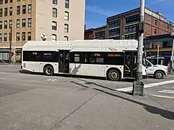 Metro began testing three new Proterra Catalyst battery electric buses in 2015.[27] The coaches are capable of traveling over 26 miles[28] before the battery needs to be recharged. A special fast charge station located at the Eastgate Park and Ride allow the bus to be fully recharged in under 10 minutes, during the driver's normally scheduled layover.[29] These new vehicles get the equivalent of 20.8 MPG, which is over 6 times better than the 3.18 MPG seen on Metro's series hybrid electric coaches.[30][31] The coaches were purchased with support from a $4.7 million Federal Transit Administration grant and entered revenue service on February 17, 2016.[32] They operate on shorter routes (due to their limited range) on the eastside, specifically Routes 226 and 241.[30][33] Metro has committed to purchasing 120 electric buses with the option to purchase up to 80 additional vehicles by 2020. In 2017 and 2018, Metro tested electric buses with ranges of 140 miles from several manufacturers,[34] and plans to have a zero-emissions bus fleet by 2040.