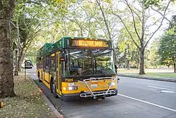 Metro's buses are painted in various color schemes that are assigned based on their type; the last major change was in 2004. The buses generally have their bottom half painted in yellow with a different color on top, including purple for electric trolleybuses[36] and red for RapidRide buses. It is intended to be replaced beginning in 2025 with the introduction of battery electric buses that are colored yellow and light blue for conventional coaches or red and purple for RapidRide.[37][38]