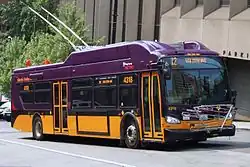 Metro maintains a fleet of electric trolleybuses that serve 15 routes along almost 70 miles[16] of two-direction overhead wire. This is the second largest trolleybus system in the United States by ridership[17] and fleet size.[18] The trolleybuses are valued by Metro both as zero-emission vehicles,[19] and as vehicles well adapted to Seattle's hilly terrain.