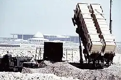 Bottom: A MIM-104 Patriot missile battery near the airport. The terminal building and mosque can be seen in the background.