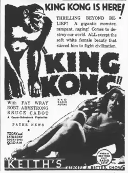 King Kong’s campaign included newspaper ads, radio ads, and posters.[128] It premiered in the Radio City Music Hall and RKO Roxy in New York City on March 2, 1933.[75][129] U. S. President Franklin D. Roosevelt declared the four-day nationwide bank holiday three days after the film's premiere in New York City.[130][131] The film was a box-office success and during the opening weekend earned an estimated $90,000.[1] Receipts fell by up to 50% during the second week of the film's release because of the national bank holiday.[132] Attendance of the film dropped within the second and third weeks of its New York release.[133] During the film's first run it made a profit of $650,000.[134] Before the 1952 re-release, the film is reported to have worldwide rentals of $2,847,000 including $1,070,000 from the United States and Canada and profits of $1,310,000.[2] The Hollywood premiere was held on March 24, 1933, in Grauman’s Chinese Theatre.[135] The screening was preceded by a performance featuring dances of Indigenous people and trapeze performances.[136] It was not officially released until April 7, 1933.[3] It was re-released in 1952 following the promising re-release of Snow White.[137] After the 1952 re-release, Variety estimated the film had earned an additional $1.6 million in the United States and Canada, bringing its total to $3.9 million in cumulative rentals in the United States.[138] Profits from the re-release were estimated by the studio to be at about $2.5 million,[3] which was about double of what the film earned in 1933.[139]