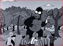 One of the most frequently used images of King Kong in popular culture is the scene where King Kong and Ann Darrow are on top of the Empire State Building. This image has been copied or parodied in cartoons, comic books, horror films, and television commercials.[2] A popular television spoof was the segment 'King Homer' from The Simpsons episode "Treehouse of Horror III", in which the King Kong story was retold featuring Simpsons characters, with Homer as Kong, Marge as Ann Darrow and Mr. Burns as Carl Denham. The spoof follows the plot of the 1933 film closely, but it ends with Marge marrying King Homer after he collapses in exhaustion, failing to climb beyond the second story of the Springfield State Building. King Kong's family, consisting of smaller apes, appear at the wedding, and Homer has a habit of eating people, such as Shirley Temple as well as Marge's father at the end. King Homer also has a cameo in the music video for "Deep, Deep Trouble" from The Simpsons Sing the Blues CD, and years later, makes another appearance in the opening couch gag of "Jazzy and the Pussycats". Homer grabs Marge from the couch and scales the Empire State Building, all while fending off 1930s-style airplanes.[1] King Homer (or Homer Kong) would reappear battling Bridezilla (a Godzilla version of Marge Simpson) in the episode "Wedding for Disaster". The character also appeared in video games such as Bart's Nightmare and Treehouse of Horror as well as various merchandise such as toys and T-shirts. The original film was referenced again on The Simpsons in the episode "Monty Can't Buy Me Love", where Mr. Burns captures the Loch Ness Monster and brings him back to America to entertain an audience; however, instead of the Monster going berserk during its debut, Burns himself is startled by the flash photography and causes the carnage.[11]