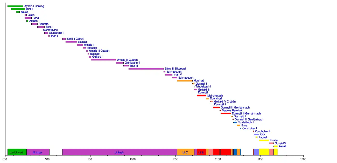 Ascall mac RagnaillGofraid mac AmlaíbBrodar mac TorcaillRagnall mac TorcaillOttar mac meic OttairConchobar Ua BriainConchobar Ua ConchobairÉnna Mac MurchadaToirdelbach Ua ConchobairDomnall GerrlámhachDiarmait mac Énna meic MurchadaDomnall GerrlámhachMagnus BarefootDomnall GerrlámhachDomnall mac TaidcGodred CrovanDonnchad mac Domnaill RemairMuirchertach Ua BriainDomnall mac MurchadaGofraid mac Amlaíb meic RagnaillToirdelbach Ua BriainDiarmait mac Máel na mBóMurchad mac DiarmataEchmarcach mac RagnaillÍmar mac ArailtEchmarcach mac RagnaillSigtrygg SilkbeardIvar of WaterfordGlúniairnAmlaíb CuaránGofraid mac SitriucBlácaire mac GofraidAmlaíb CuaránBlácaire mac GofrithOlaf GuthfrithsonGofraid ua ÍmairSitric CáechÍmar ua ÍmairGlúniarannSichfrith JarlSitriuc mac ÍmairSichfrith mac ÍmairHalfdan RagnarssonBárid mac ÍmairOistin mac AmlaíbAuisleÍmarAmlaíb ConungO'Brien dynastyUí CeinnselaigUí ÍmairUí Ímair