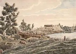 Cataraqui River at Kingston Mills, with blockhouse in centre-right
