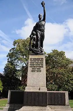 The memorial is topped by a large bronze sculpture, which depicts a nude warrior raising aloft a burning crucifix in his left hand, while his right holds a sword which he uses to strike a serpent. At his right side are two small children, whom he is protecting.[2] Goulden was particularly skilful at the depiction of children, another recurring theme in his work. An earlier example, from 1914, was the memorial to the feminist social reformer Margaret MacDonald at Lincoln's Inn Fields, itself Grade II listed.[8][9] Cast into the base of the bronze sculpture are lines from the fourth stanza of Laurence Binyon's poem For the Fallen; "AT THE GOING DOWN OF THE / SUN AND IN THE MORNING / WE WILL REMEMBER THEM".[4]
