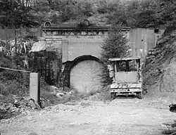 ![]() The east portal of the 1911 Kingwood Tunnel, with the closed-up 1858 portal visible at above right | |
