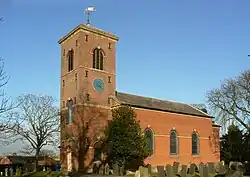 A new parish church of St Luke was built for the Earl of Gainsborough in 1792–93, close to the canal, and is a relatively rare example of a village parish church from this period. It is built in red brick, consisting of a nave and chancel, with a vestry to the north-east and a three-stage tower at the western end. It has been Grade II* listed since 1965.[2] It replaced a church dedicated to St Wilfred which was located to the north of Kinoulton Lane. Although the building was demolished, the churchyard remains and contains a group of 34 headstones dating from the 1700s.[3]