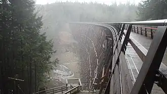 The bridge's dimensions measure 44 m (144 ft) high and 188 m (617 ft) long, making it the largest wooden trestle in the Commonwealth of Nations and one of the highest railway trestles in the world.[2] It was constructed out of old-growth Douglas fir timbers,[3] and has an unusual seven-degree curve.[4]