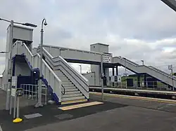 Facilities include a new footbridge and lifts for step-free access, bike storage facilities and a 168-space car park including disabled parking and 24 charging spaces for electric vehicles. Signs and benches from the original station were refurbished and installed at the new station.[17] The station is accessible generally including ticket machines; there is a waiting room but no ticket office.[18]